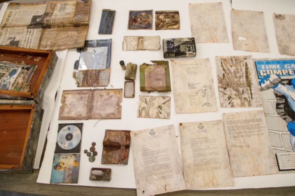 Dois jovens, vencedores de um concurso nacional na época, foram os responsáveis por escolher os objetos que melhor representariam a vida daquele momento. A cápsula também continha moedas britânicas, um holograma de floco de neve e uma folha de papel reciclado — detalhes que contam histórias de um tempo que parece distante, mas permanece vivo na memória de muitos.