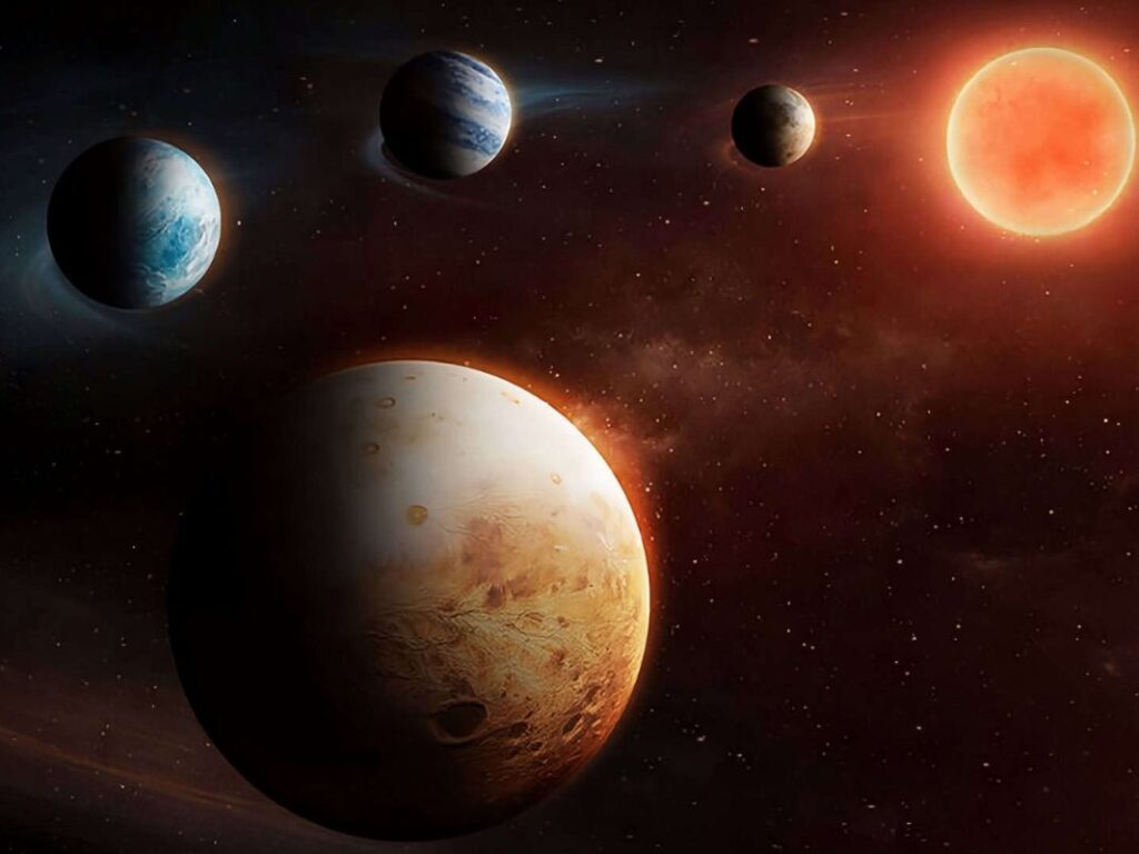 A estrela no centro desse sistema é a LHS 1903, uma anã vermelha fria, menor e menos luminosa que o Sol. Ao seu redor, orbitam quatro planetas. A princípio, tudo parecia seguir o padrão comum: mundos rochosos próximos e gigantes gasosos mais distantes.